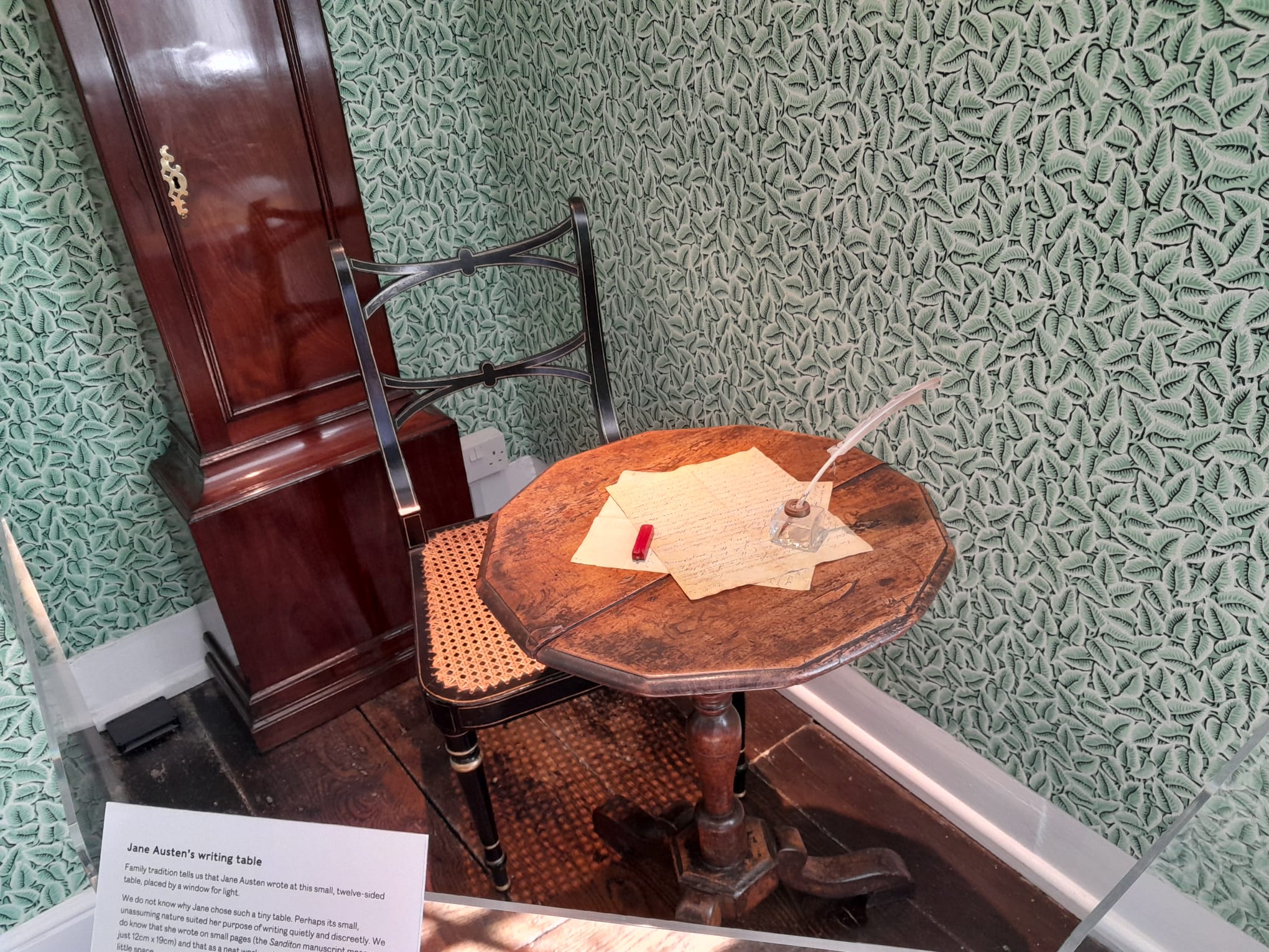 The house is part staged reconstruction (downstairs), part exhibit (upstairs). Seeing Jane’s writing table and her surviving hand written manuscript drafts on tiny sheets of folded paper, shows that in the literary world size doesn’t always matter.