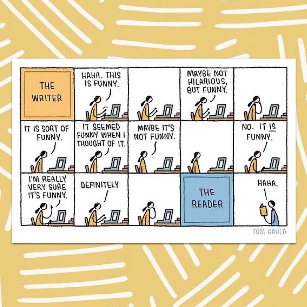 Another reason I find this image particularly relatable is because it is me right now. Yes, I am indeed a stick drawing with a blob of a body, tirelessly reviewing and re-reviewing every joke and humorous jab listed in my manuscript.